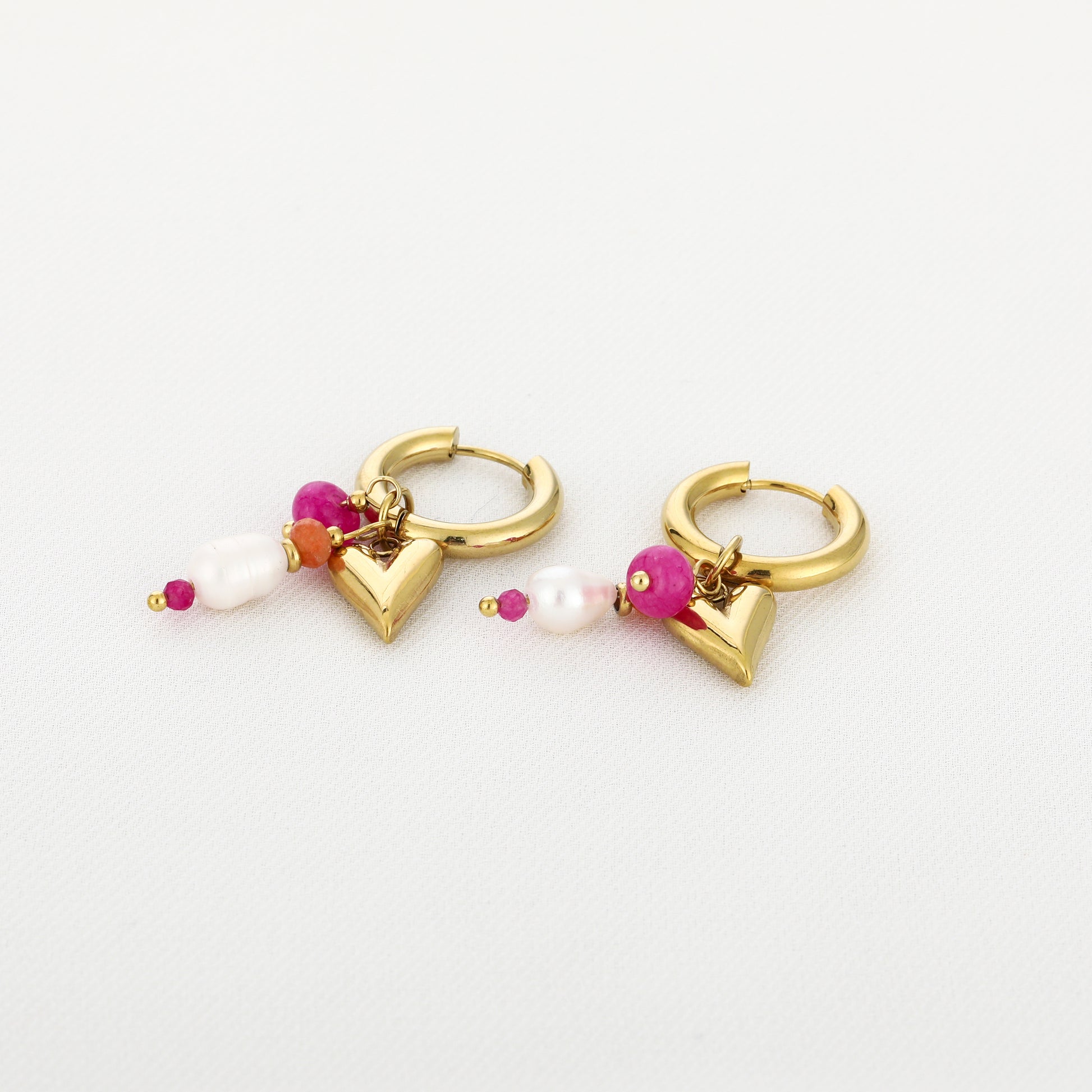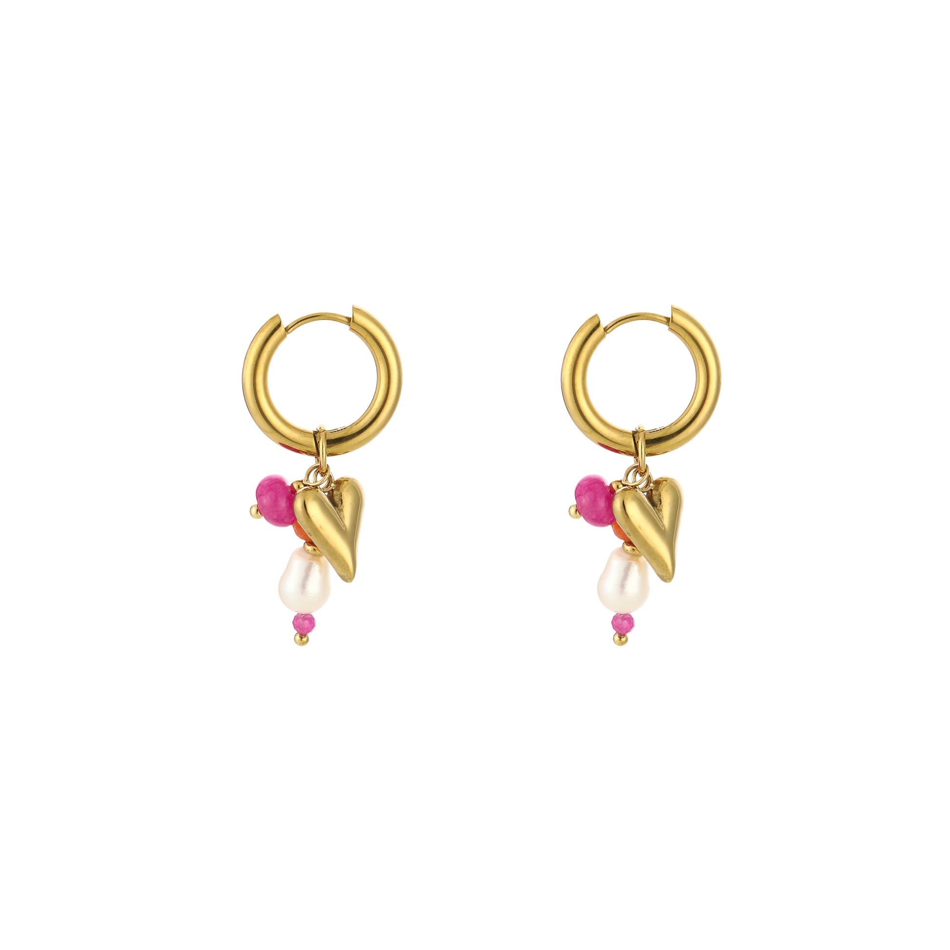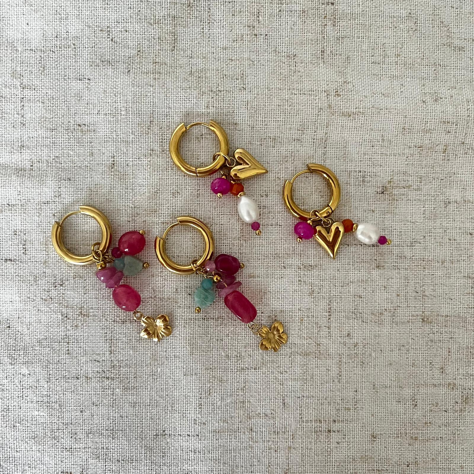 Oorbel Rosa is uniek door de verschillende hangers en kralen, met vrolijke tinten.